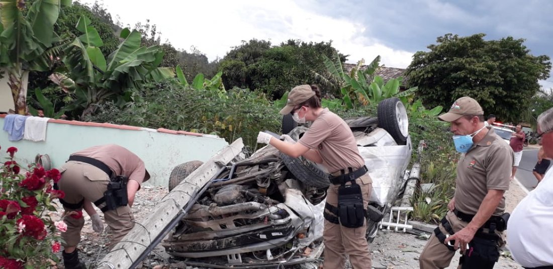 A Polícia Militar (PM) de Armazém, atendeu uma ocorrência de acidente de trânsito na SC-435, no bairro São Francisco. No incidente houve uma saída de pista com colisão em um poste e também no muro. Após colidir no muro o carro, um Gol de cor prata, com placas de Armazém capotou.