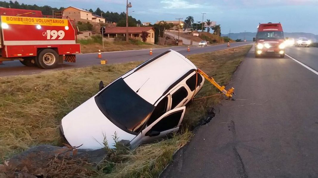 Os bombeiros voluntários de Jaguaruna, Sangão e Treze de Maio foram acionados para atender a uma saída de pista na BR-101, próximo ao acesso à Cidade das Praias. A ocorrência foi registrada por volta das 5h30min.