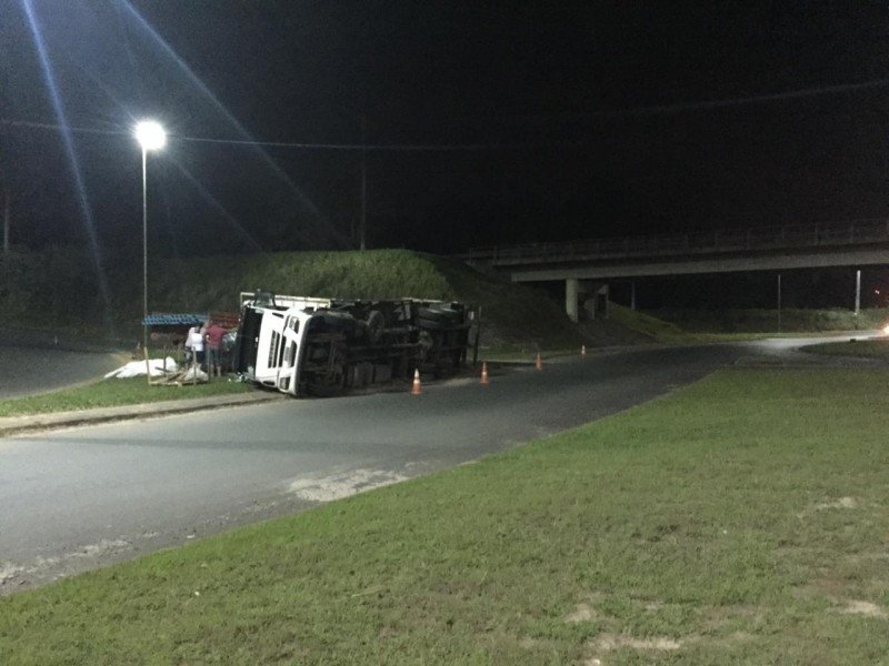 Uma carreta, com placas de Criciúma, tombou na rodovia Jorge Zanatta, em Içara. O acidente ocorreu por volta das 19 horas desta quarta-feira, 20.