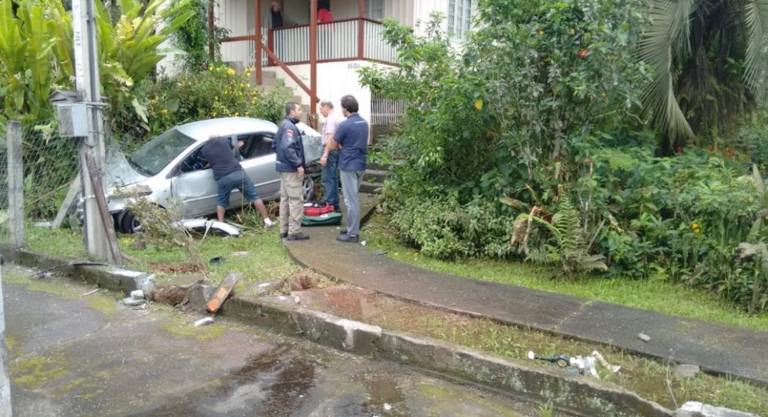 Um motorista perdeu o controle de um Corolla com placas de Blumenau, bateu contra um poste e invadiu o quintal de uma casa da rua Hermann Huscher, no distrito do Garcia, próximo à antiga danceteria Enigmas.