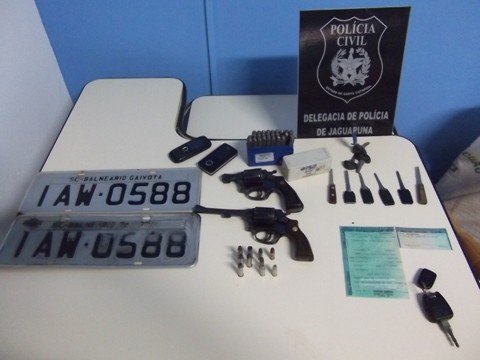 Os policiais encontraram dois revólveres – calibres 32 e 38, respectivamente -, munições, placas de um carro, várias chaves michas e um kit com pinos para marcação e pintura de chassi. Tudo estava escondido na churrasqueira da casa. Também foi apreendido um Astra. A suspeita é que seja adulterado.