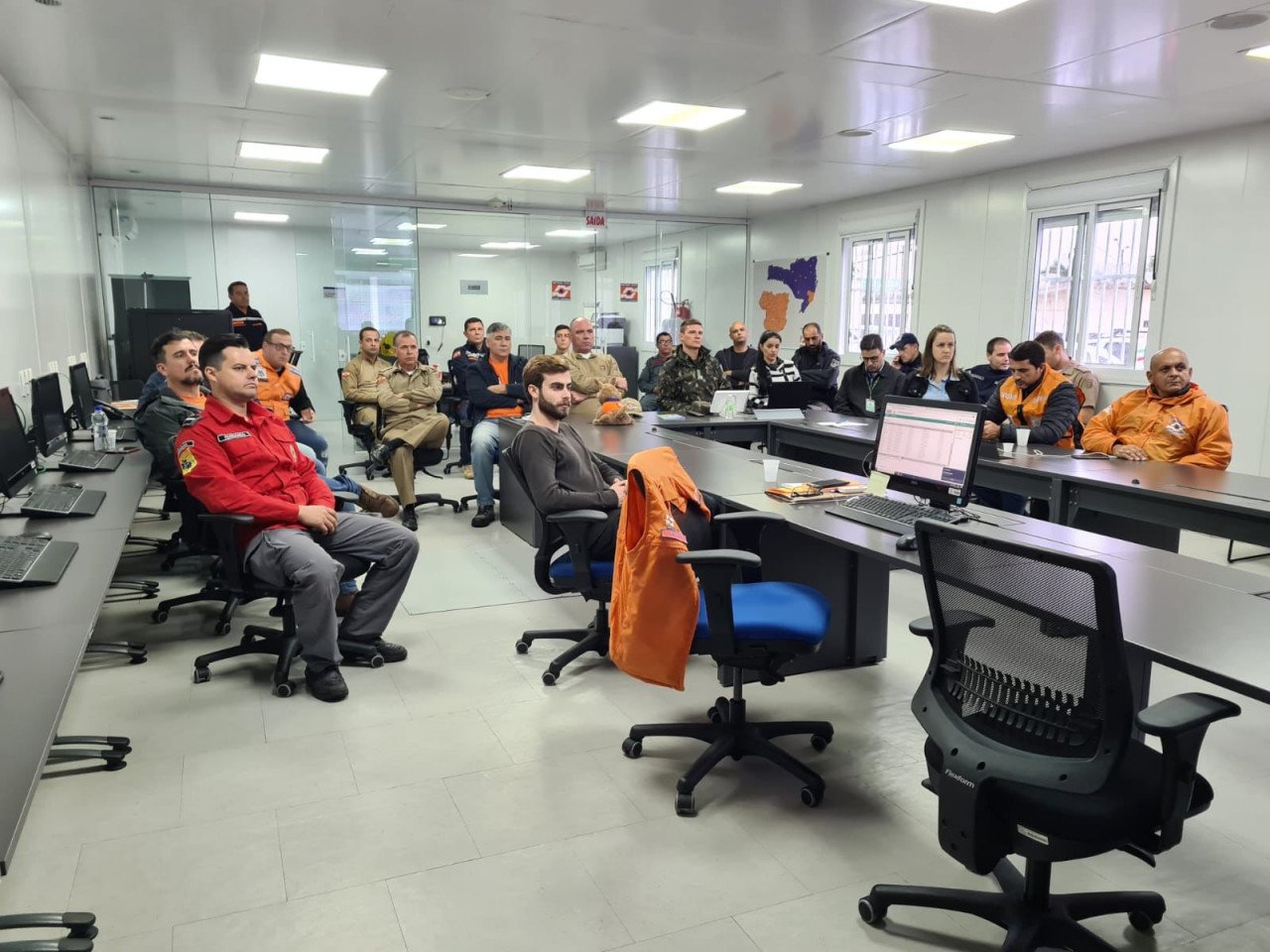 Reunião, na tarde desta segunda-feira (02), em Tubarão, com todas as equipes de Segurança Pública e Defesa Civil da região, objetivou repassar planos de contingência e alinhar planos de ação municipais por conta da grande quantidade de chuva prevista para o Sul de Santa Catarina nos próximos dias – Foto: Defesa Civil do Estado | Divulgação