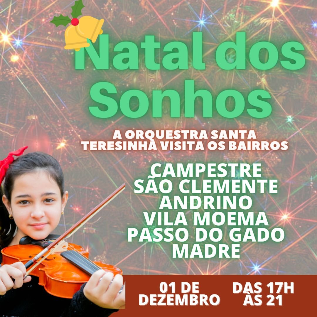 A Orquestra Santa Teresinha do Menino Jesus, bairro Passagem, iniciará a maratona de visitação em alguns bairros da cidade nesta quarta-feira (1º). Com um presépio itinerante e um trenzinho da alegria, as crianças levarão uma mensagem de esperança e o espírito natalino para as famílias.
