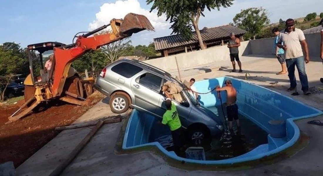 Para retirar o veículo da piscina foi necessária a ajuda de um trator que içou o carro para fora.