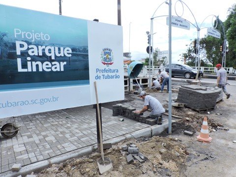 A obra de revitalização da beira-rio chegou a ponte Nereu Ramos, no Centro, em Tubarão, e faltam apenas alguns metros para finalizar a pavimentação do primeiro trecho que iniciou próximo na ponte pênsil da Unisul.