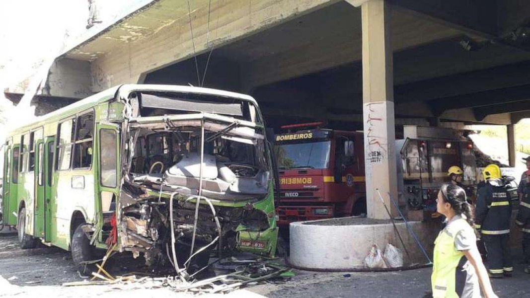 Um ônibus do transporte coletivo de um viaduto em Contagem, na Região Metropolitana de Belo Horizonte. O acidente deixou vários feridos e mobiliza equipes do Corpo de Bombeiros, Serviço de Atendimento Móvel de Urgência (Samu) e a Polícia Militar.