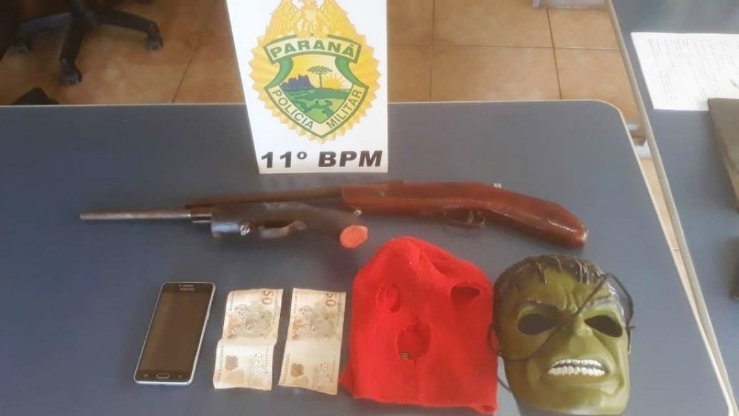 Na residência foram encontrados o celular da vítima, o dinheiro roubado, a máscara do Hulk e duas armas. Eles foram presos em flagrante e devem responder pelo crime de roubo agravado.