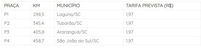 Foi definido para o sistema rodoviário um esquema de pedagiamento com quatro praças, conforme tabela a seguir: