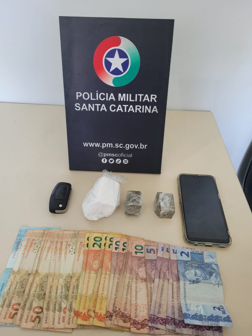 As características do carro e do motorista foram encaminhadas para a guarnição do Pelotão de Patrulhamento Tático (PPT). No local indicado, o veículo foi avistado e abordado. Na busca foi encontrado 98 gramas de cocaína e 48 gramas de maconha. Com o suspeito os policiais do PPT apreenderam um aparelho de telefone celular e R$ 927 em dinheiro. Os itens encontrados, o carro e o homem foram levados para os procedimento legais na Delegacia de Polícia Civil de Imbituba.
