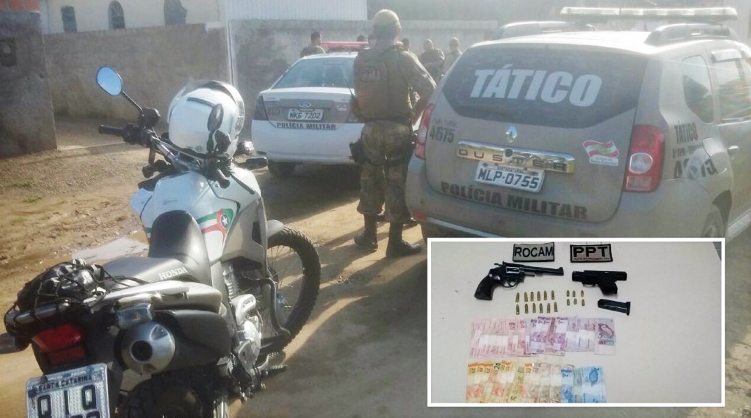 Por diversas vezes, a dupla foi flagrada exibindo fotos em poder de armas de fogo e ameaçando moradores na comunidade. E na tarde desta quarta-feira (17), uma viatura caracterizada realizou uma ronda no local e ao perceber a presença dos policiais, os dois entraram em uma oficina de chapeação. Diante da situação, foram repassadas informações às equipes do Pelotão de Policiamento Tático (PPT) e da Ronda Ostensiva Com Apoio de Motocicletas (Rocam), que montaram uma operação e lograram êxito em abordar a dupla. Eles conseguiram dispensar as armas, mas em busca nas proximidades, foram encontrados um revólver calibre 38 municiado com seis munições intactas e uma pistola calibre 380, com numeração suprimida, com seis munições intactas, além de mais seis munições de revólver calibre 38. Estava em posse do adolescente um celular Motorola e R$ 541 em espécie. Com o adulto, foi encontrado R$ 150 em dinheiro. Mediante dos fatos, foi dada voz de prisão aos dois. O adolescente, que possui 13 boletins por diversos atos infracionais, foi levado à delegacia especializada, enquanto o maior, que tem 34 passagens por crimes como homicídio, tráfico de drogas e porte ilegal de armas, foi encaminhado à Central de Plantão Policial (CPP). Ele também é integrante de uma facção criminosa que atua na Cidade Azul.