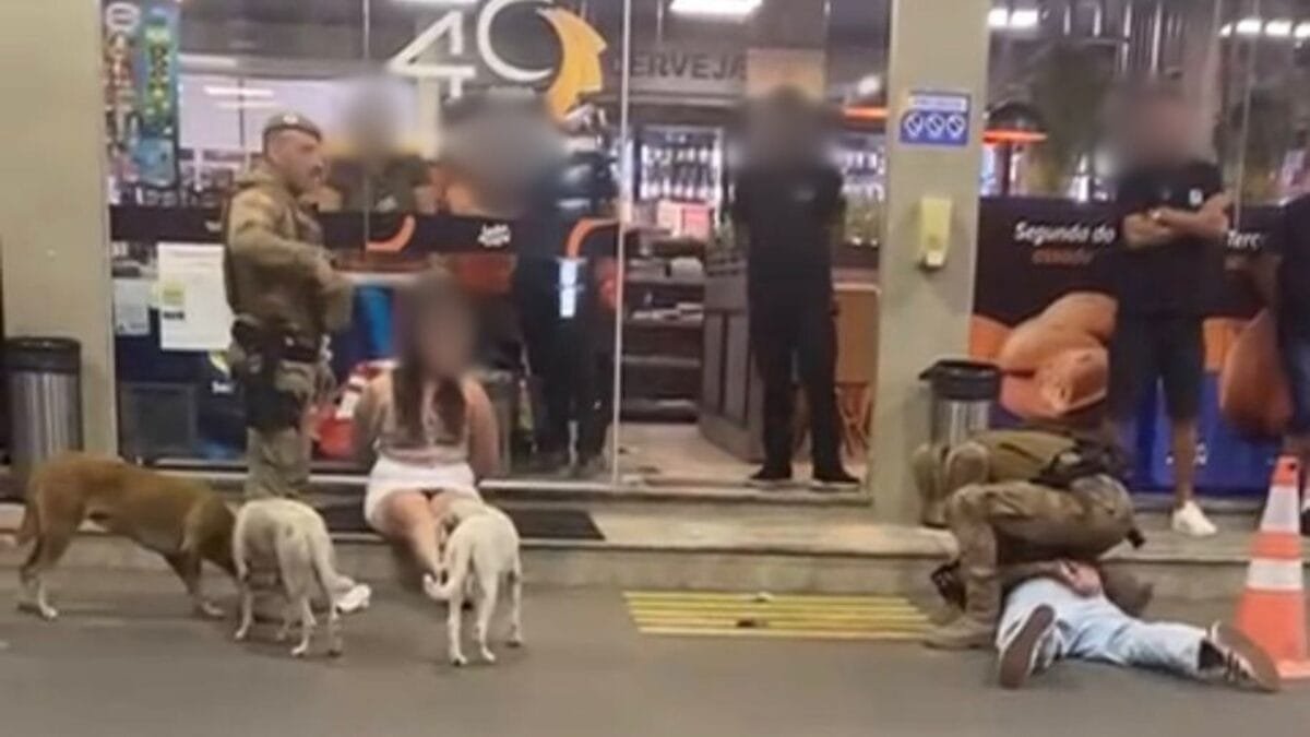 As imagens registram o momento em que policiais abordam um homem, que estava sendo revistado sob a mira de uma arma longa. Durante a revista, ele grita de dor e, em seguida, uma mulher se aproxima do local, aparentemente filmando a ação com um celular.