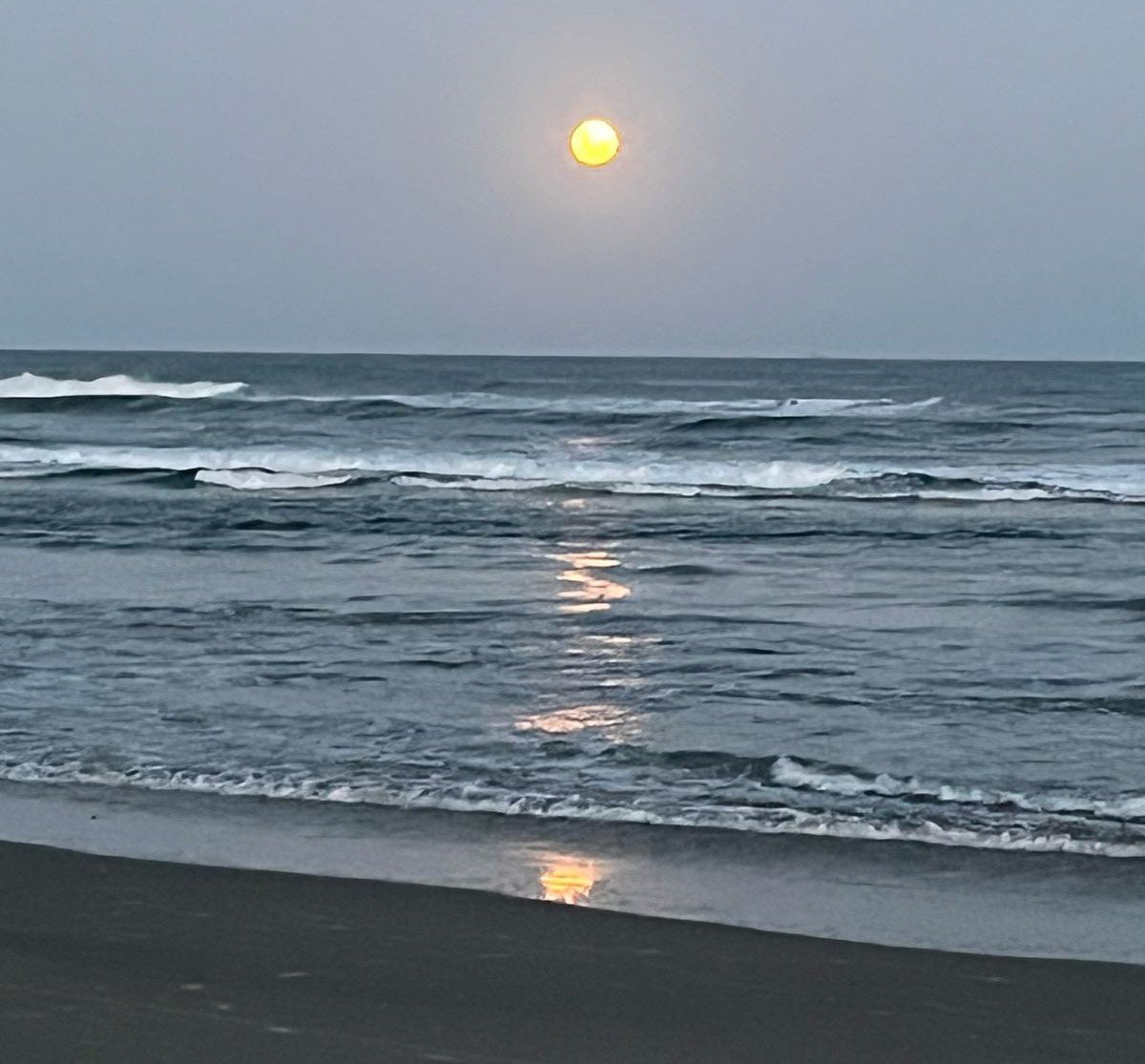 Logo após o sol desaparecer, a lua cheia surgiu no horizonte marítimo com coloração avermelhada intensa e tamanho aparente ampliado. O fenômeno, comum quando o astro está próximo da linha do horizonte, ocorre devido à dispersão da luz na atmosfera.