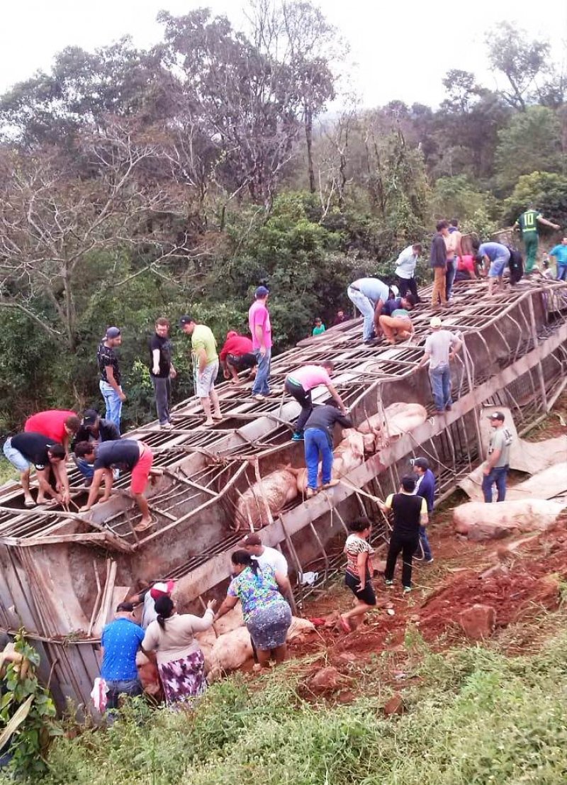 Um caminhão cheio de porcos tombou na BR 163, no trecho próximo a Capitão Leônidas Marques/PR, sudoeste do Paraná, na tarde deste domingo (10), e teve a carga saqueada por moradores. O motorista ficou ferido levemente e recusou atendimento médico.