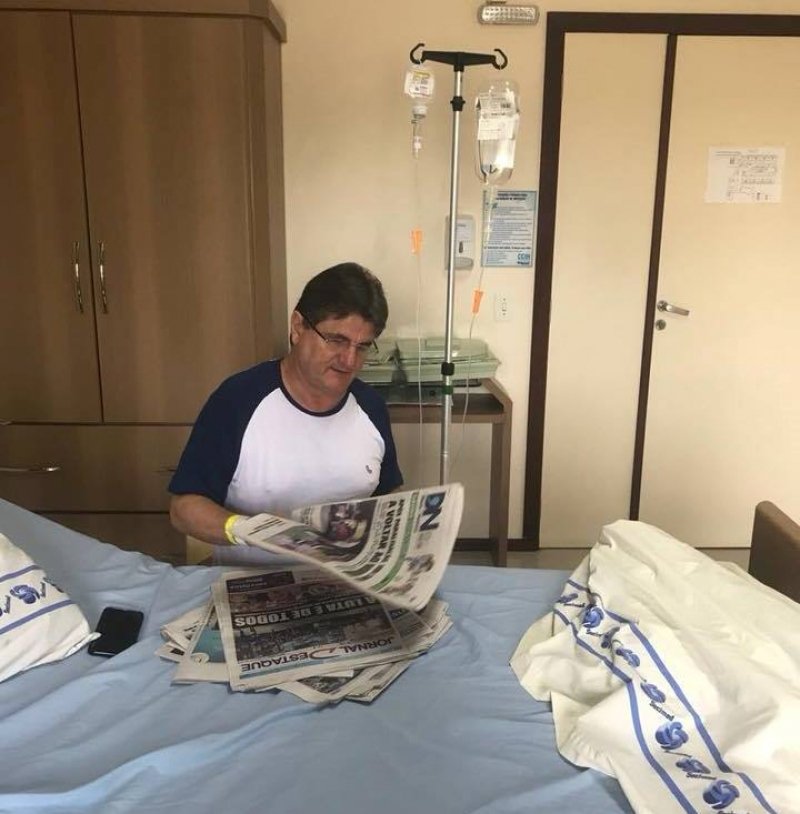 “Seis dias de internação, ontem pensando, hoje pela primeira vez, recebi jornais impressos da região para atualização das notícias. Alta? Não depende de mim, mas de Deus e dos médicos. Aguardo com tranquilidade. ( fotos escondidas da Julia, que tá comigo)”, disse o prefeito na rede social.