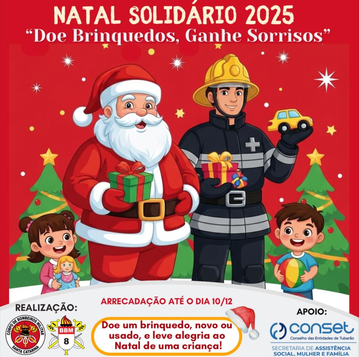 A Prefeitura de Tubarão é parceira do Corpo de Bombeiros Militar na campanha “Natal Solidário 2025 – Doe Brinquedos, Ganhe Sorrisos”, que busca levar alegria e esperança às crianças em situação de vulnerabilidade neste fim de ano.