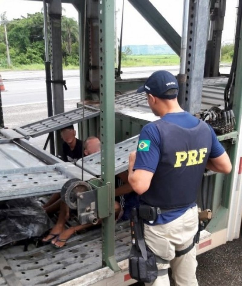A Polícia Rodoviária Federal (PRF) flagrou três homens sendo transportados no compartimento de carga de um caminhão de transporte de veículos. O fato foi registrado na noite da quinta-feira (17), na BR-101, em Tubarão.