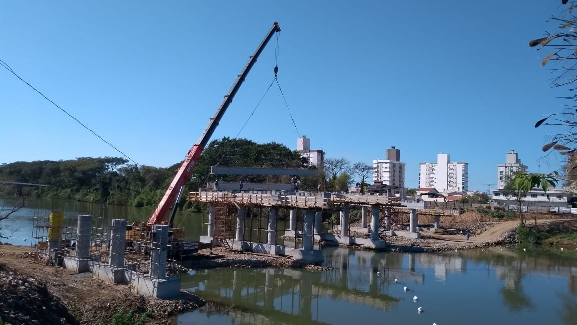 Para a colocação das primeiras vigas, foi necessário a locação de um guindaste especial junto a uma empresa de Joinville. No domingo serão colocadas outras 14 vigas a partir da margem esquerda, sendo necessário o fechamento de parte da rua Lauro Müller nas imediações do acesso do canteiro de obras.