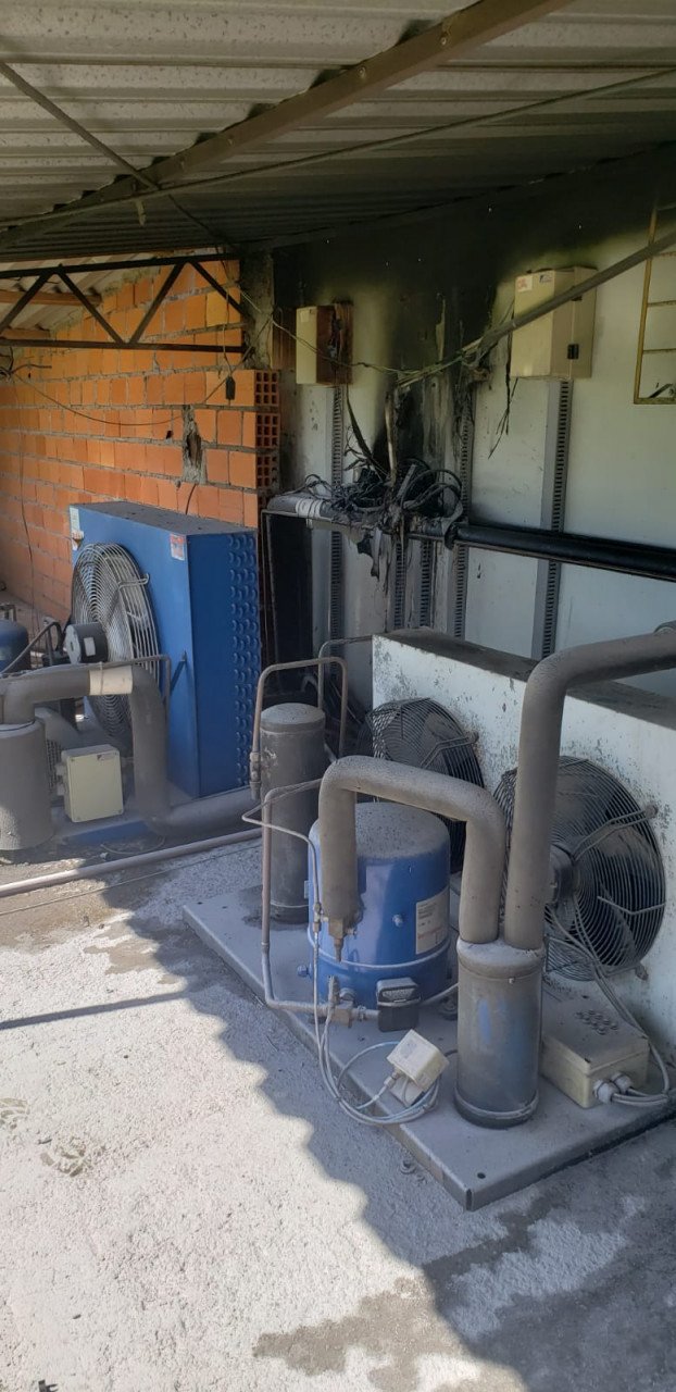 Chegando no local, os funcionários guiaram a equipe para a área de origem do fogo. Tratava-se dos controles dos refrigeradores que ficavam na parte externa da edificação em cima das câmaras frias.