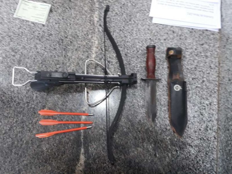 Ao chegar ao local, o sargento e o soldado Gouvea Pereira encontraram o homem sentado e aparentando estar muito nervoso. Quando os PMs o abordaram e pediram para ver o conteúdo da mochila, o professor tentou resistir e acabou contido. Na mochila, foram encontrados dardos, a besta (arma também utilizada no ataque à Escola Estadual Raul Brasil, em Suzano) e uma faca Imbel.