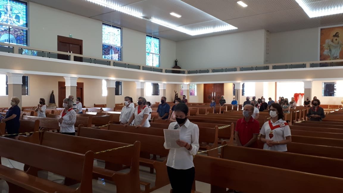Nesta sexta-feira, estão programadas três missas para facilitar a presença das pessoas, pois cada celebração terá capacidade para 105 fiéis no santuário. A primeira foi às 9h (foto), as outras serão realizadas às 15h e às 19h. As missas serão transmitidas pelo Facebook (Paróquia Santuário Sagrado Coração de Jesus).