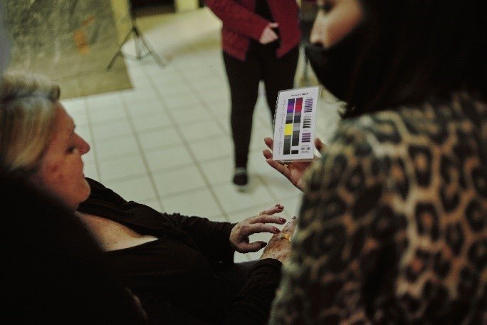 Maquiadoras se voluntariaram no projeto também oferecendo seus serviços, e algumas das participantes que já haviam realizado o teste de cores, puderam contar com uma make personalizada se beneficiando das cores que melhor as favoreciam. Teve também a escolha dos lenços para compor a foto, buscando a melhor escolha em cor e estampa relacionada a cartela.