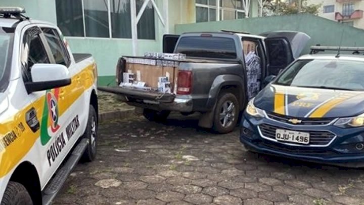 Ambas ocorreram na quarta-feira (5). Por volta das 7h, na BR-282, em Catanduvas, uma VW/Amarok completamente carregada de cigarros foi abordada pelos policiais durante patrulhamento pela rodovia. Dentro do veículo foram localizados aproximadamente 25 mil maços de cigarros contrabandeados.
