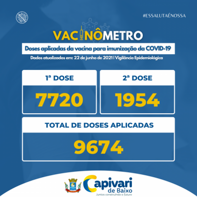 No boletim ‘Vacinômetro’ divulgado na noite desta terça-feira (22), pela Vigilância Epidemiológica de Capivari de Baixo, aponta que 38,3% dos moradores já foram imunizados ao menos com uma dose contra a Covid-19. A expectativa é que até o fim do ano, este quadro alcance próximo dos 80%, restando apenas crianças e adolescentes, último grupo-alvo para receber a medicação contra a doença, que já ceifou, até esta noite, 66 vidas de capivarienses.