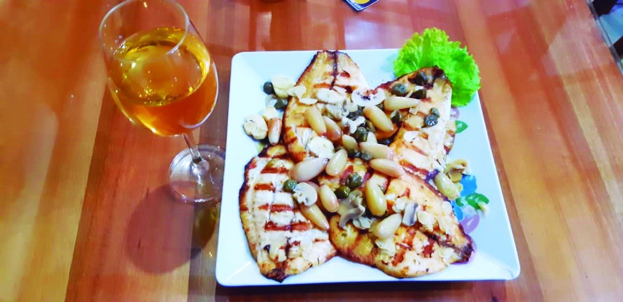 Tempere o peixe com tempero completo e deixa marinar por 20 minutos. Unte a chapa com a manteiga, aqueça e coloca os filés. Deixe dourar e vire. Acrescente as alcaparras, as amêndoas e o champignon. Doure a banana, faça uma cama no prato e coloque os filés. Termina com alcaparras, champignon e amêndoas em cima.