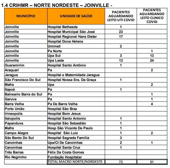 A macrorregional Norte/Nordeste, onde a cidade referência é Joinville, é a mais crítica atualmente: existem 72 pacientes aguardando leitos de UTI Covid-19, mais 51 pacientes aguardando leito em enfermaria.
