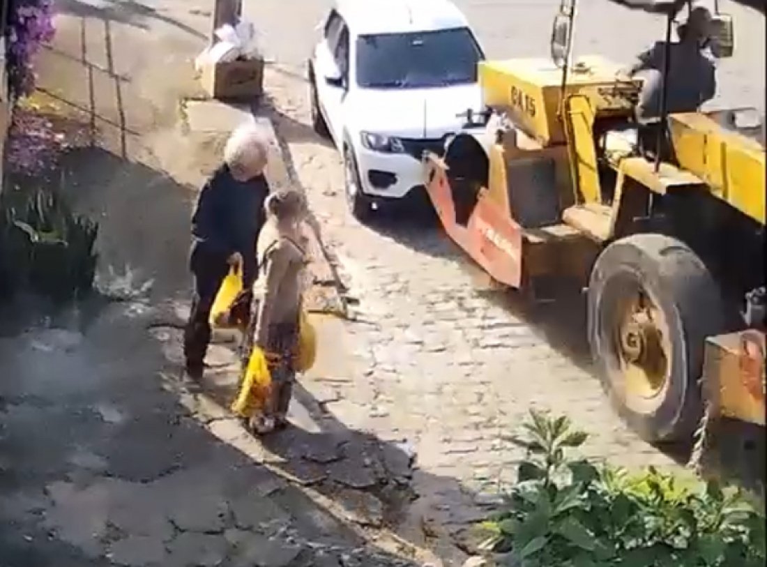 O vídeo de segurança mostra que duas pessoas estavam passando pela calçada no momento do acidente. Felizmente, os pedestres não foram atingidos pelo rolo compressor.