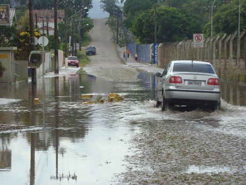 Em apenas uma hora e meia, 22 milímetros de chuva. Esta quantidade foi suficiente para alagar algumas ruas de Tubarão na tarde de ontem. O tempo abafado e quente dos últimos dias levou à formação de nuvens e consequentemente precipitação.