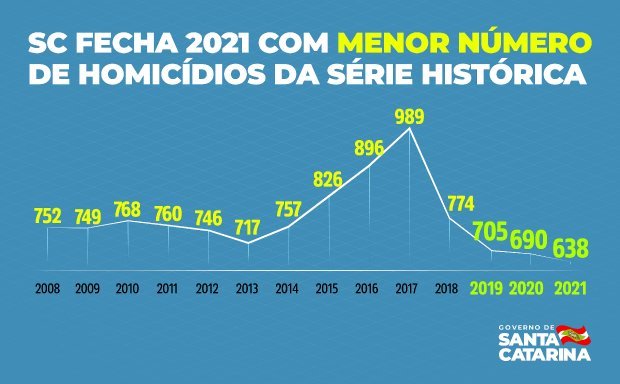 Com redução dos crimes violentos em todo o estado a Segurança Pública de Santa Catarina teve um saldo positivo em 2021. Os homicídios tiveram queda de 7,5%, passando de 690 em 2020 para 638 no ano passado. Trata-se do menor número desde que o indicador passou a ser contabilizado, no ano de 2008.