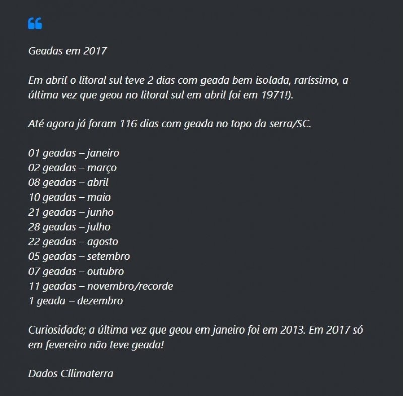 De acordo com o Climaterra, em 2017 só não teve registro de geada no mês de fevereiro.