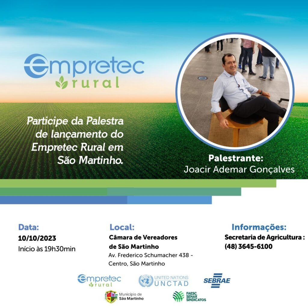 O Município de São Martinho, em parceria com o Sebrae/SC, vai sediar pela primeira vez uma edição do Empretec Rural, considerado o maior seminário de empreendedorismo do mundo, chancelado, inclusive, pela Organização das Nações Unidas (ONU). A iniciativa tem como propósito aumentar a rentabilidade das empresas, estimular novos negócios e gerar, entre outros benefícios, novas oportunidades de empregos.