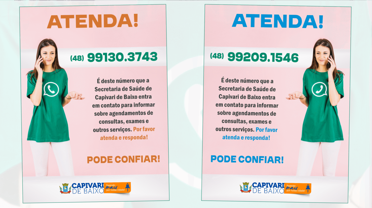 A Secretaria de Saúde de Capivari de Baixo está utilizando o aplicativo de mensagens WhatsApp como ferramenta oficial de comunicação com os pacientes que utilizam os serviços de saúde do município. Os contatos, feitos por texto ou ligações de voz, partem exclusivamente dos números (48) 99130-3743 e (48) 99209-1546.