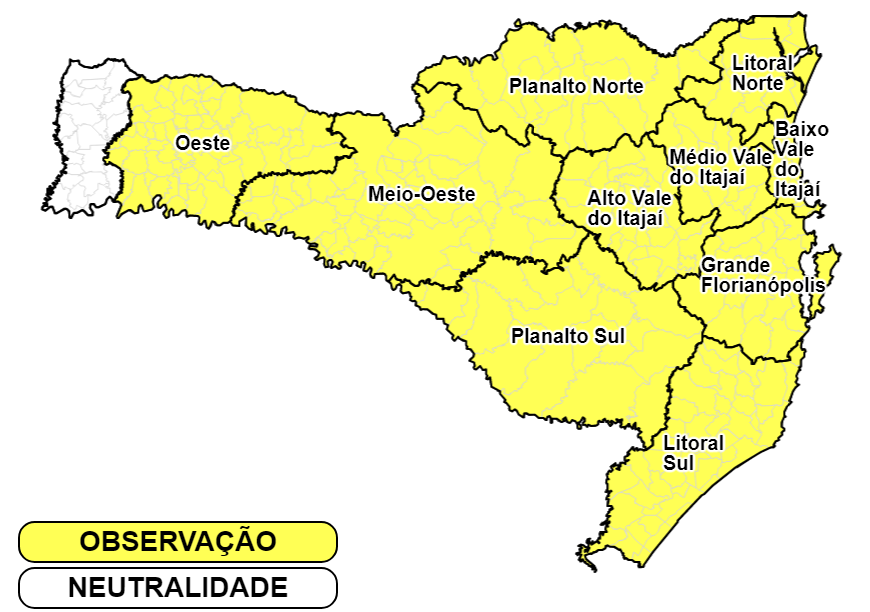 Conforme o órgão, do Oeste ao Litoral há maior chance da ocorrência de temporais isolados, associados a chuva intensa. Não se descarta a ocorrência de temporais bem isolados no Extremo Oeste.