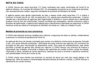 A Caixa Econômica Federal (CEF), em Imbituba, confirmou hoje (11) que seis funcionários testaram positivo para a Covid-19. Os empregados estão em isolamento domiciliar com acompanhamento médico, seguindo as orientações dos protocolos do Ministério da Saúde.