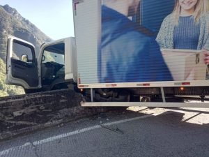 Um caminhão bateu em uma mureta na manhã desta quarta-feira (14) na Serra do Rio do Rastro. O acidente de trânsito ocorreu por volta das 6h, na rodovia SC-390, km 407,500, em Lauro Müller.