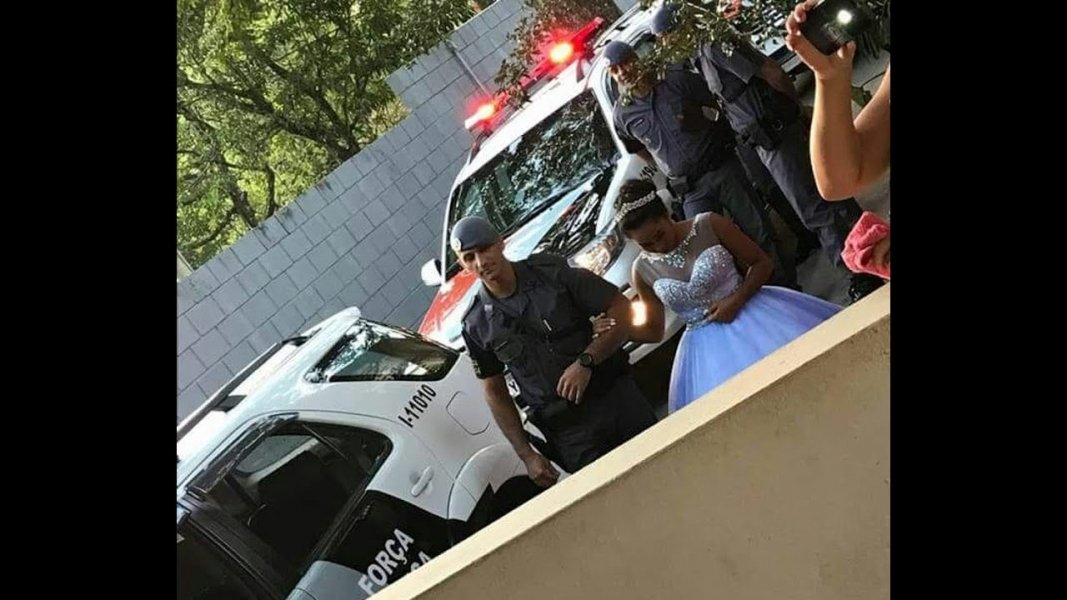 A jovem Camilly Regina resolveu inovar em sua festa de 15 anos. Em vez de chegar ao local em uma limousine, ela escolheu entrar na cerimônia em uma viatura da Polícia Militar.