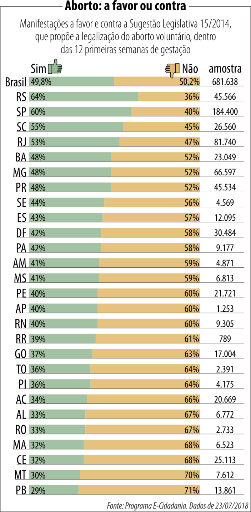 A maioria dos quase 682 mil votantes é do estado de São Paulo, onde a sugestão alcança mais apoio: com 110 mil votos. Do outro lado, o número também é expressivo: 74,5 mil pessoas não querem a descriminalização do aborto. Essa tendência se repete no Rio de Janeiro, segundo maior participante da pesquisa realizada pelo Portal e-Cidadania do Senado, com 44 mil votos pelo “sim” e 38 mil votos contra na contagem mais recente. Em seguida vem Minas Gerais com um total de 66,5 mil votos, onde o “não” ao aborto legalizado vence por cerca de três mil votos. Já no Rio Grande do Sul, que aparece em quarto lugar com a participação de 45,5 mil pessoas, a diferença é bem maior: são 13 mil votos a mais, só que a favor da proposta.
