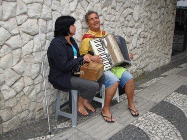Animados e alegres, Mauri, 63 anos, e Maria, 50, foram a sensação, ontem, no calçadão de Tubarão. Ele toca acordeão. Ela canta um repertório eclético de músicas sertanejas e folclóricas. Detalhe: os dois são deficientes visuais. Mauri perdeu a visão aos 30 anos. Maria aos 25. Mas nem por isso deixaram de fazer aquilo que adoram: música.