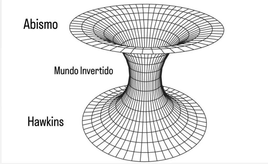 Na lógica da série, o buraco de minhoca liga Hawkins a uma dimensão chamada Dimensão X, também associada ao Abismo, onde Vecna se fortalece. O Mundo Invertido funciona como o corredor dessa ligação, uma versão distorcida da cidade criada pela própria conexão entre os dois extremos.