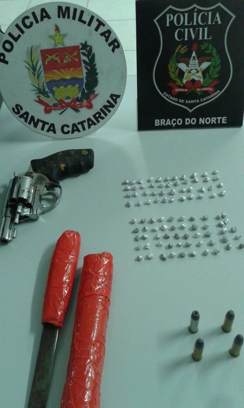 Três pessoas, de 18, 35 e 38 anos, foram presas por tráfico de droga, associação ao tráfico e porte de arma de fogo, e uma adolescente de 17 apreendida em Braço do Norte. As polícias Civil e Militar da cidade receberam a informação de que uma pessoa viria de Cocal do Sul para abastecer um traficante na Cidade do Vale.
