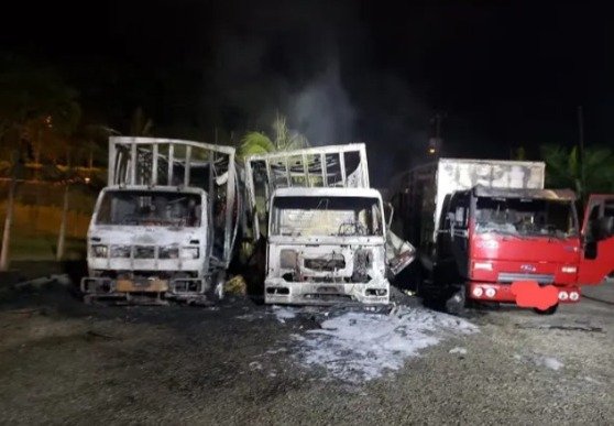 Os veículos, sendo um Ford Cargo, um Mercedes Benz Atego e um Volkswagen 23.220, foram completamente destruídos. Um ônibus e um carro, que estavam estacionados ao lado dos caminhões incendiados, foram salvos.