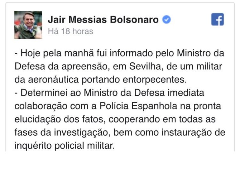 O próprio Jair Bolsonaro anunciou terça à noite nas redes sociais “a apreensão, em Sevilha, de um militar da aeronáutica portanto entorpecentes”. “Caso seja comprovado o envolvimento do militar nesse crime, o mesmo será julgado e condenado na forma da lei”, concluiu o presidente.