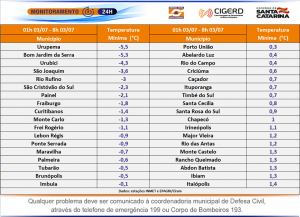 Temperatura: baixa na madrugada e amanhecer com geada do Oeste ao Planalto, e mais isolada no Alto Vale do Itajaí, Litoral Sul e Florianópolis Serrana. Em elevação durante o dia.