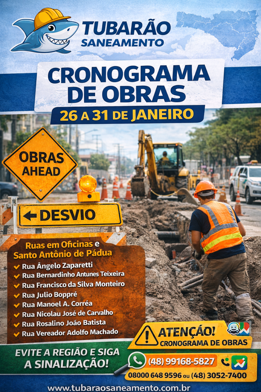 A Tubarão Saneamento divulgou o cronograma das obras previstas para serem executadas entre os dias 26 e 31 de janeiro em diversos pontos de Tubarão, a Cidade Azul. A programação pode sofrer alterações em caso de chuva ou outras interferências operacionais.