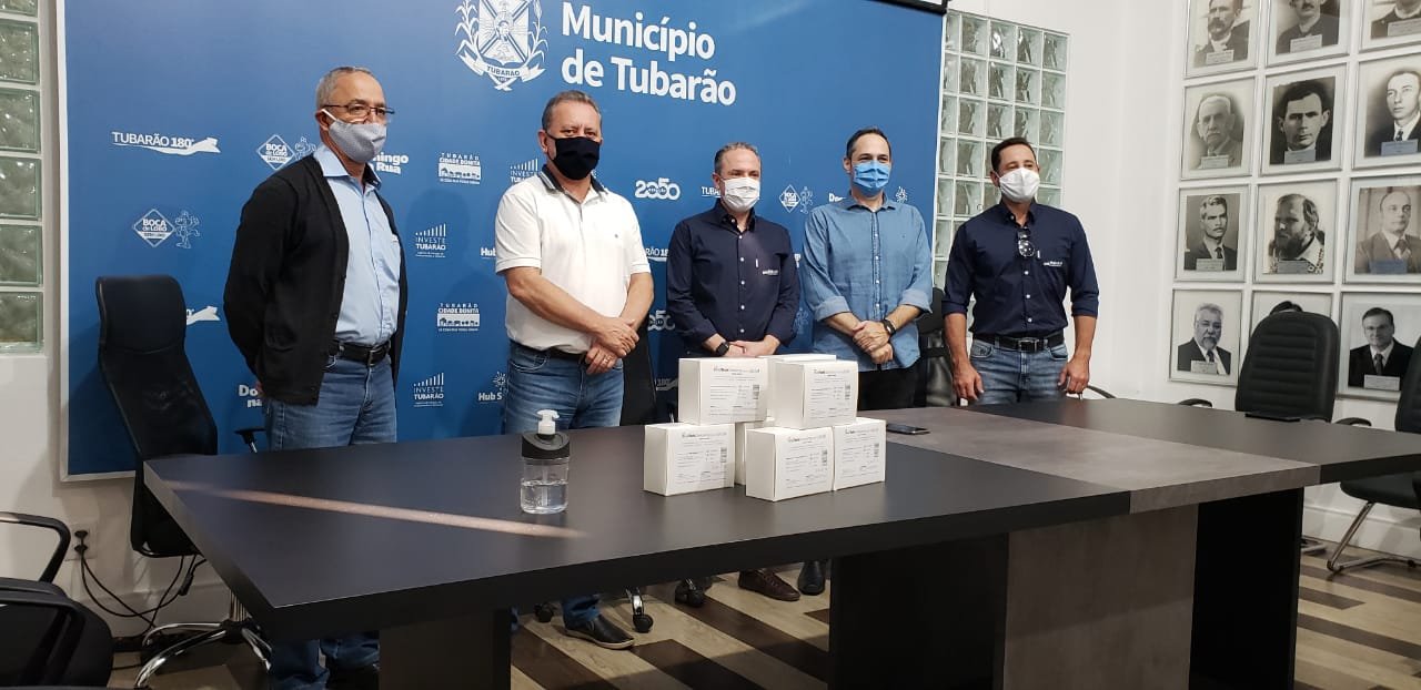 Representantes da Tubarão Saneamento visitaram o prefeito Joares Ponticelli na tarde desta terça-feira (19), para um ato que contribui com o enfrentamento da pandemia da Covid-19 na cidade. A empresa, concessionária dos serviços de água e esgoto em Tubarão, fez a doação de 450 testes rápidos, para serem empregados na testagem da população para o novo coronavírus.