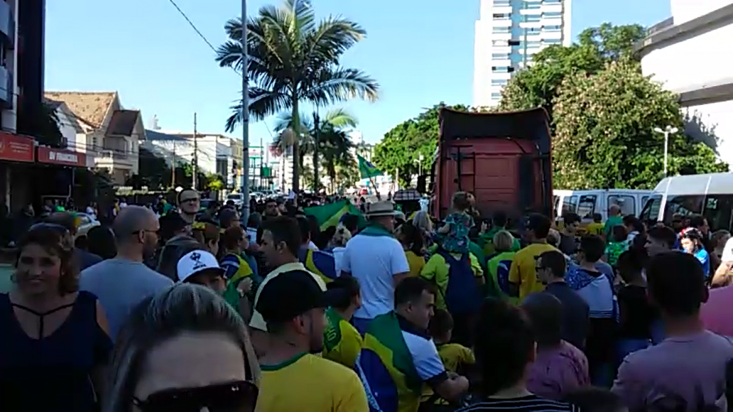 Há carros de som tocando o Hino Nacional, pessoas vestidas de verde amarelo, cores da bandeira do Brasil.