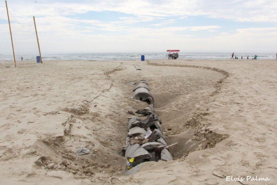 Uma tubulação surgiu na areia da praia do Mar Grosso, em frente à praça Nelson Moreira Netto (a ‘praça do Villa’), aparentemente após ter sido danificada. Os tubos são de concreto e estavam enterrados.